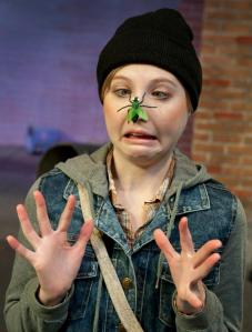In Circle’s version, this tale is retold by a homeless man, Mack, (Shane Strawbridge) to his friend, Frankie (Eric Dobbins). In Mack’s version, the tailor is a latchkey youth referred to as “The Kid” (Mikaela Krantz). Upset that his parents are so often away from home, he leaves his lonely apartment for parts unknown. On designer Clare Floyd DeVries’ city street set passersby are transformed into folk tale characters. An irate businessman becomes an Ogre (Jim Johnson) who The Kid befriends after besting him in a test of squeezing water from a stone and rock throwing by substituting cheese for a rock and a bird for the stone.